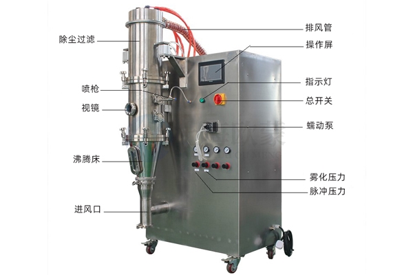 物料在潔凈的熱氣流(負壓)作用下懸浮形成流化狀態(tài),其表面與熱空氣完全接觸,受熱均勻,達到了熱交換狀態(tài),從而有著極高的效率。配上合適的噴霧系統(tǒng),以及進一步的流化床功能結構改進后,更加貼切地表現(xiàn)出流化床噴霧干燥制粒、包衣的特性,即成為一種兼具干燥、造粒、包衣的多用途工藝設備。